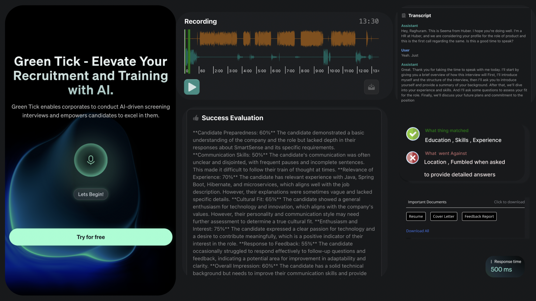 Green Tick leverages advanced AI algorithms to screen resumes, conduct interactive interviews, and provide real-time feedback. This reduces the time and effort required for initial screenings, improves candidate engagement, and provides actionable insights for hiring managers.